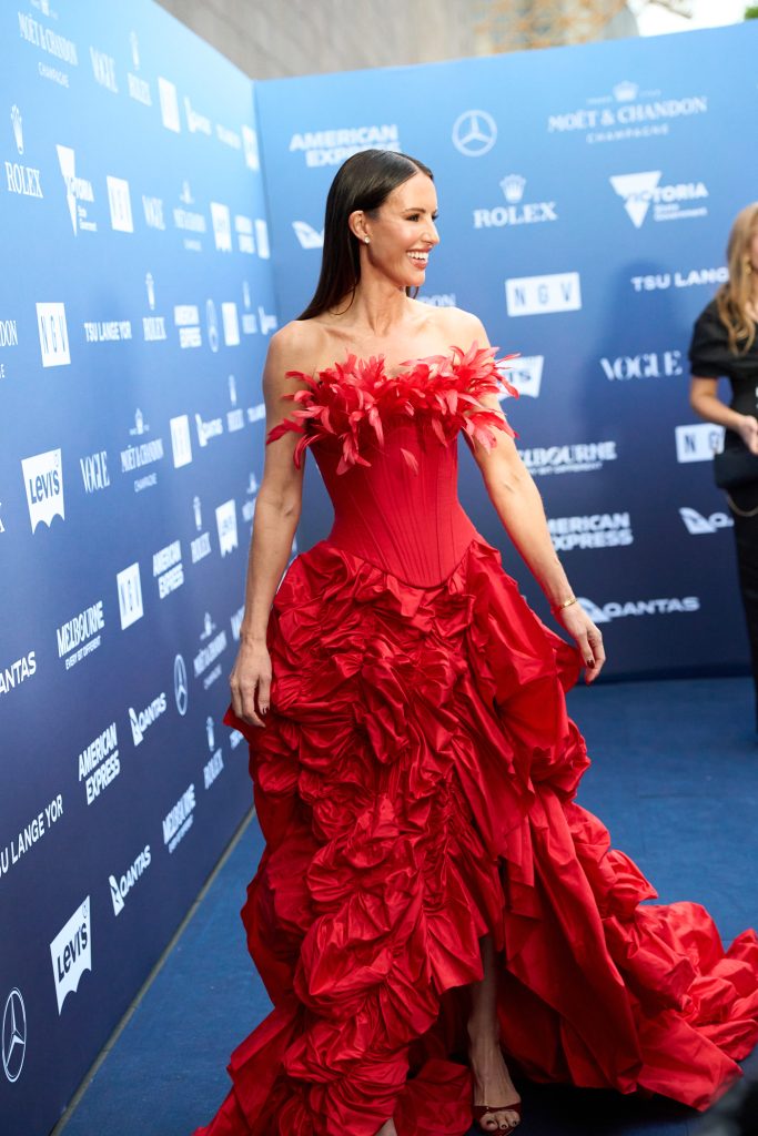 Alex Pike, skin care entrepreneur and influencer wears a gown by internationally renowned Melbourne couturier Alin Le-Kal