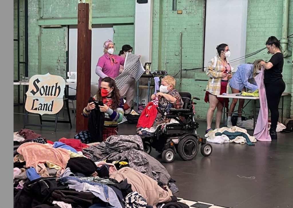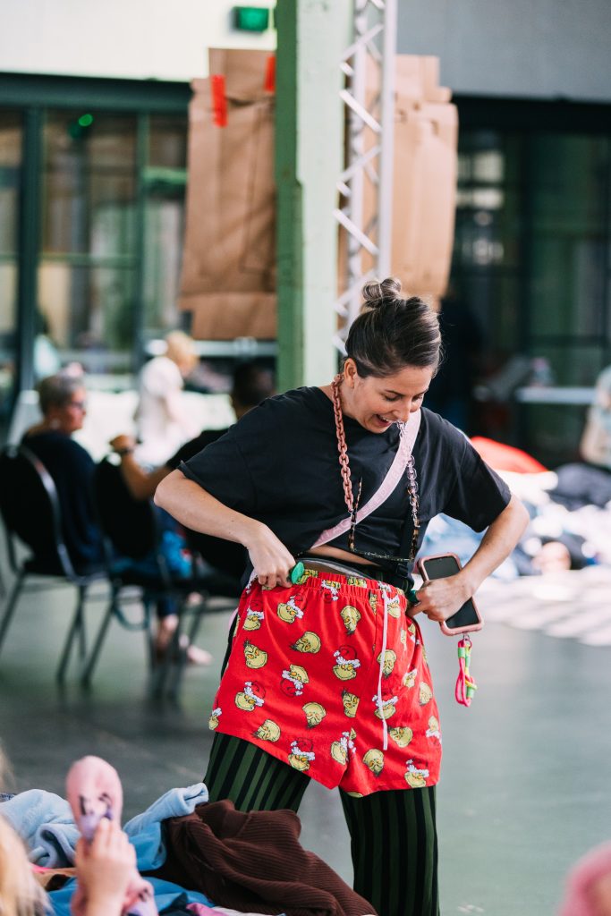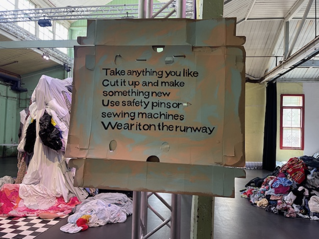 This is the first of three two-hour sessions; virtually a six-hour near-non-stop runway across the day. As participants, we are encouraged to pick through the mountains of clothing waste then pin and sew outfits to wear in the show.