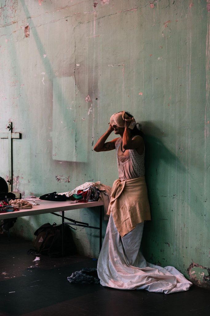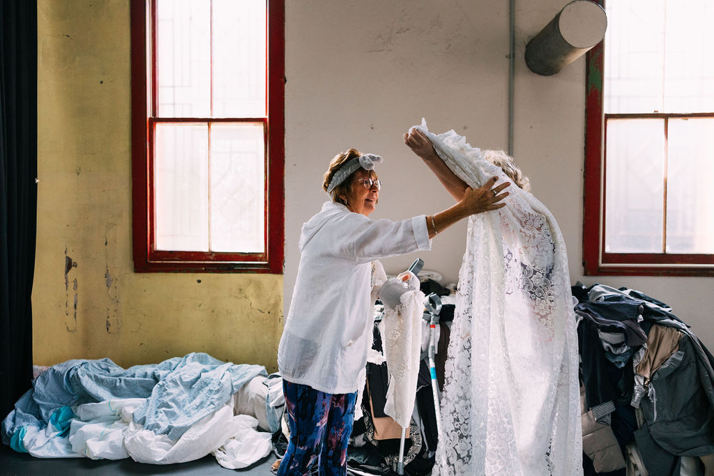 What hits me first; mountainous piles of clothing, sickly mint green walls, a scatter of people in various stages of undress. Then Tenille greets me dressed in bright layers: a frilly pink nylon apron, an oversized head bow, badges and shoulderpads pinned to a floral top and stripey tights.