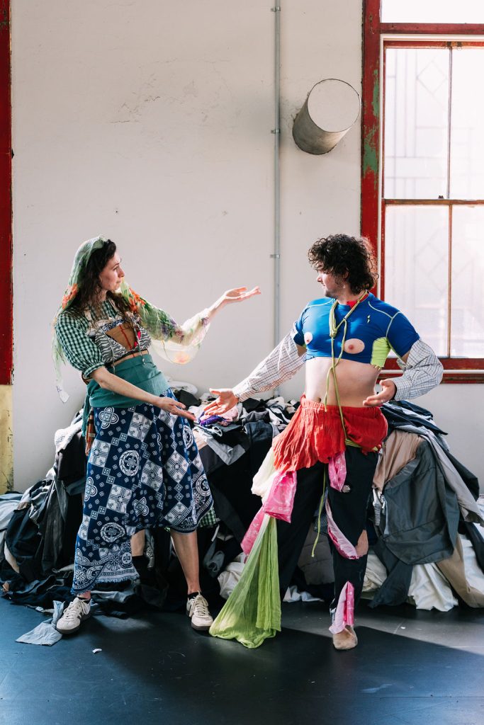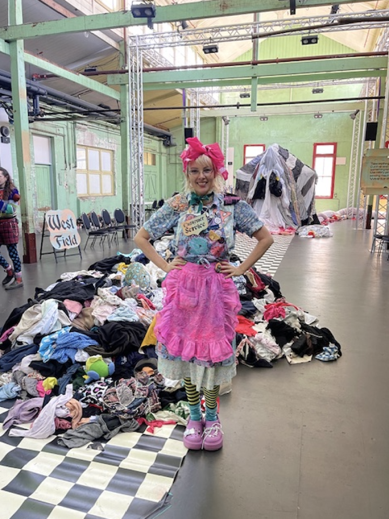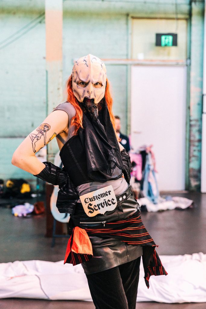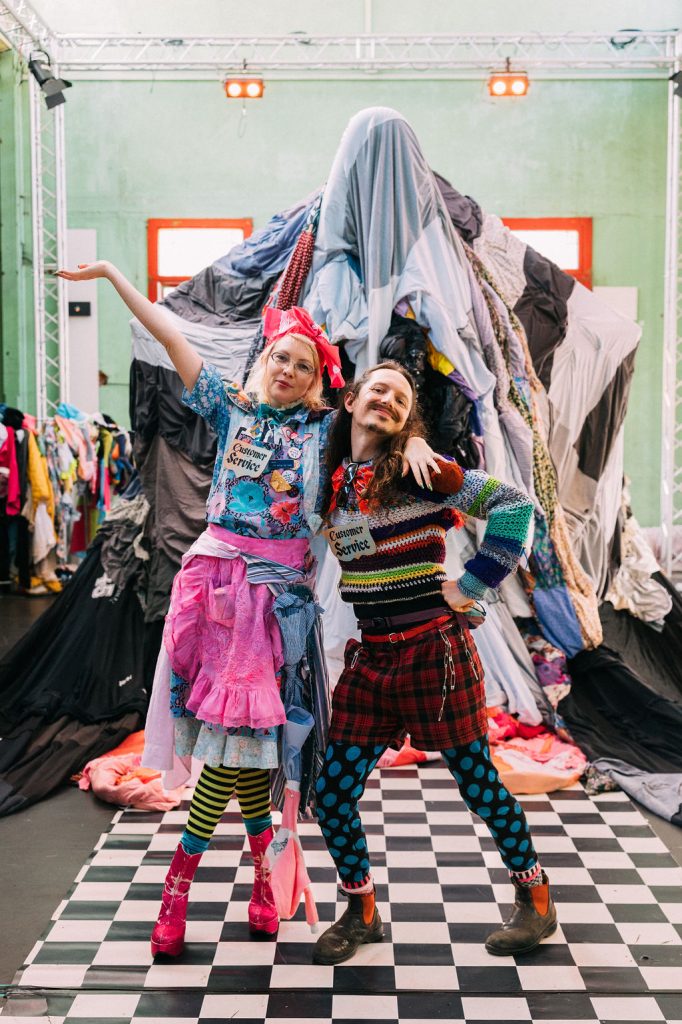 Creative collaborators Snuff Puppets have joined the show. “This collaboration brings together our love of large-scale sculptural worlds with Fast Fashun’s sharp commentary on mass consumption culture,” says the performance troupe of giant hand-made puppet’s Nick Wilson. “Together we’ve created a space where environmental crisis becomes creative catalyst—complete with a giant clothes monster puppet with ten-meter arms.”
